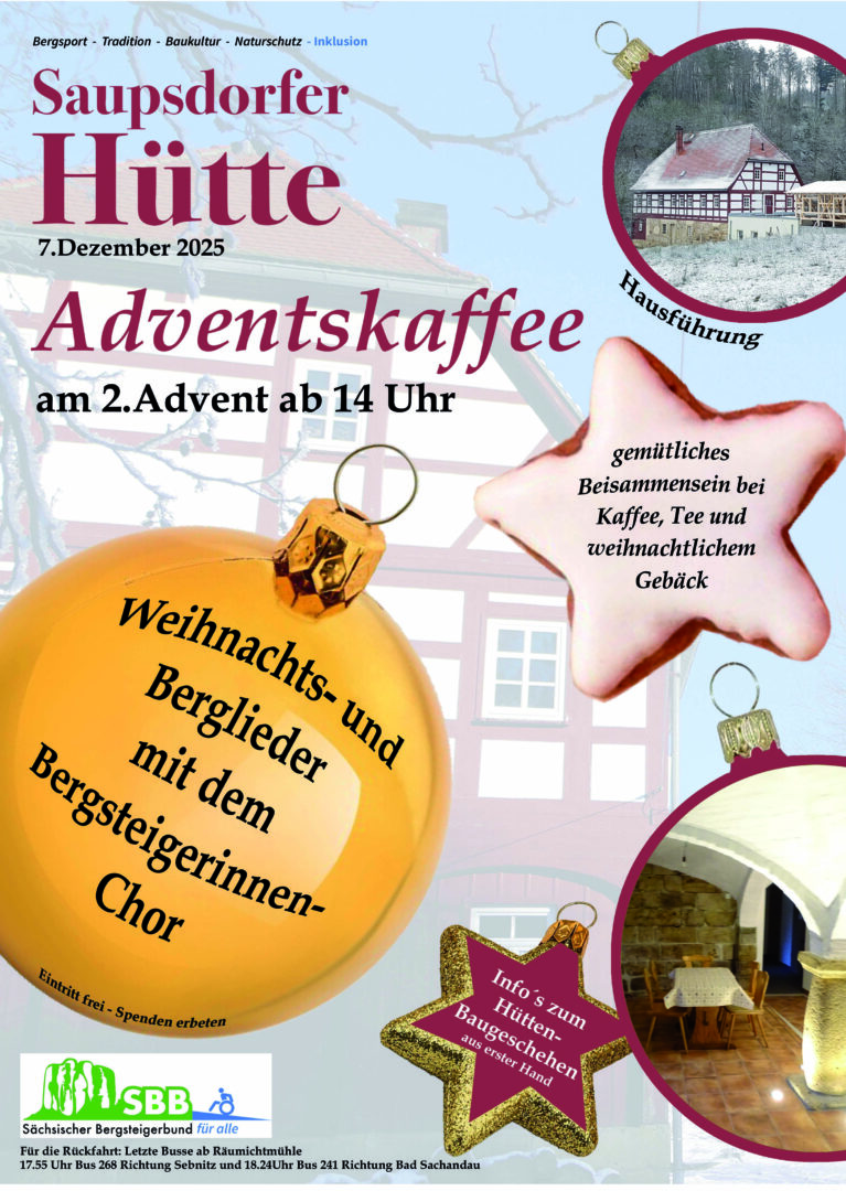 Ab 14 Uhr wird es zum Adventskaffee in der Saupsdorfer Hütte bei weihnachtlichem Gebäck wieder eine gute Gelegenheit zur Besichtigung der in den letzten Jahren erweiterten und umgebauten Hütte geben. Das Hütten-Team steht für alle Fragen zu Baugeschehen und Hüttennutzung bereit. Durch die umfangreichen, durch LEADER-Förderung mitfinanzierten Maßnahmen kann die Selbstversorger-Hütte nun auch barrierefrei besucht werden.
