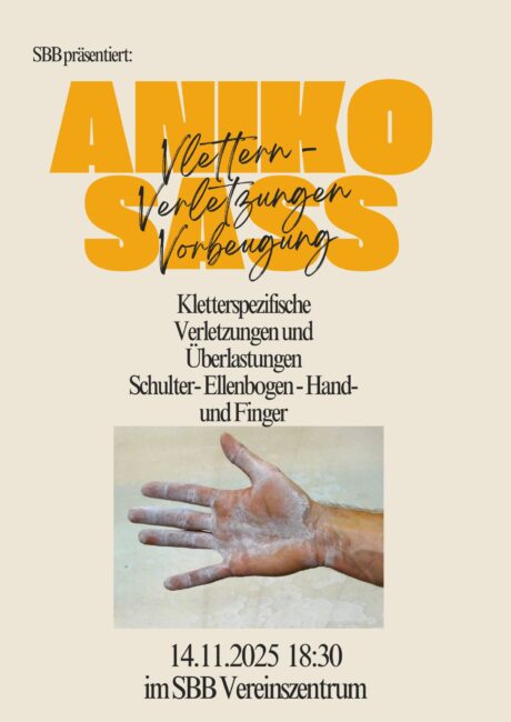 Am 14.11.25 findet ab 18.30 Uhr ein Vortrag mit der Überschrift Risiken und Prävention von Handverletzungen im Klettersport von Aniko Saß statt.