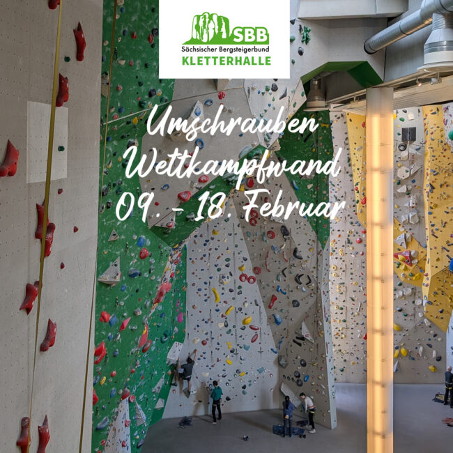 bitte beachtet, dass vom 09. – 18. Februar die Wettkampfwand umgeschraubt wird und es in diesem Zusammenhang zu Einschränkungen im Hallenbetrieb kommen kann.
