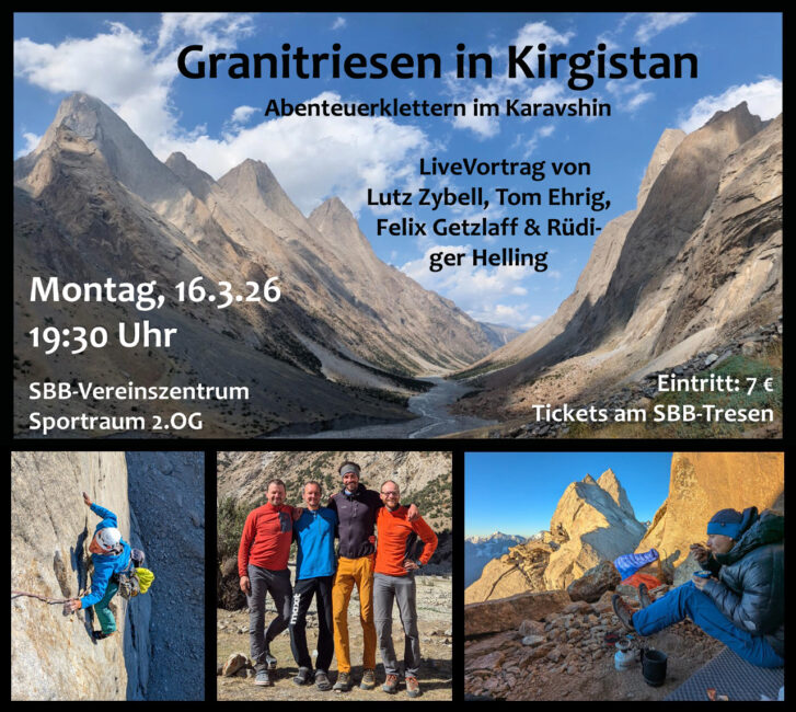 Am 16.3.26 um 19.30Uhr erwartet Euch ein spannender Vortrag zum Klettern in Kirgistan von Tom Ehrig, Lutz Zybell, Felix Getzlaff und Rüdiger Helling. Sie werden Euch in zahlreichen Bildern und spannenden Erzählungen auf ihr Abenteuer mitnehmen.